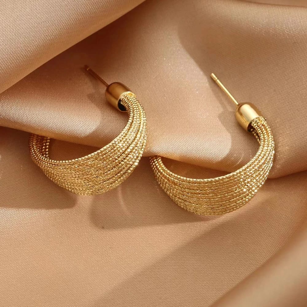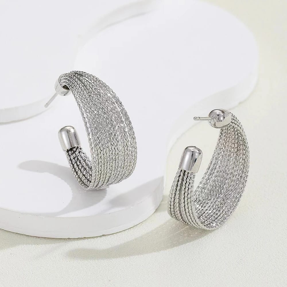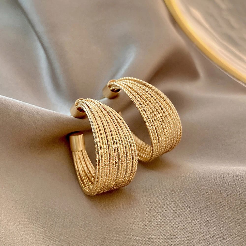 أقراط دائرية عريضة مصممة بخيوط معدنية متشابكة بشكل فني فخم، متوفرة بلونين أنيقين: الذهبي والفضي، تناسب كل الأذواق والمناسبات.