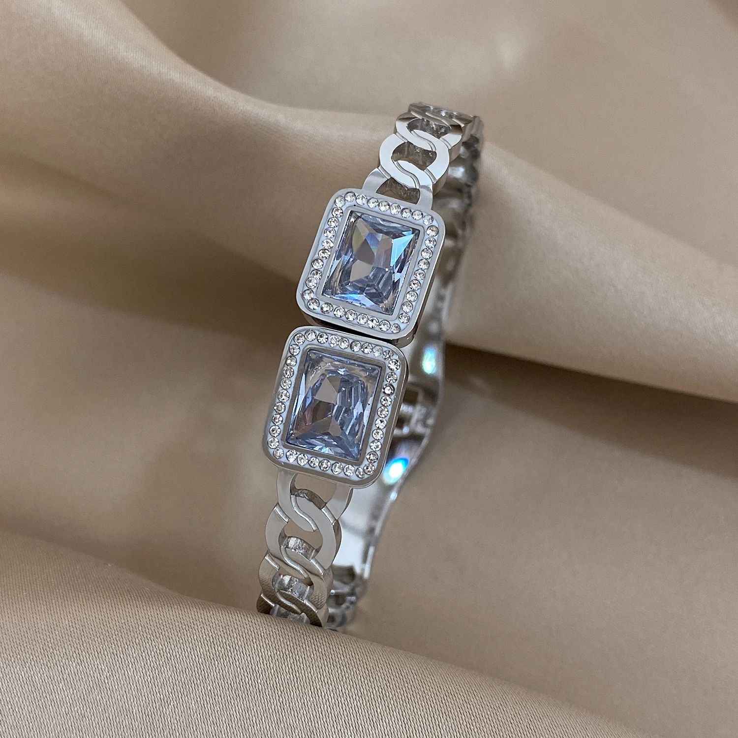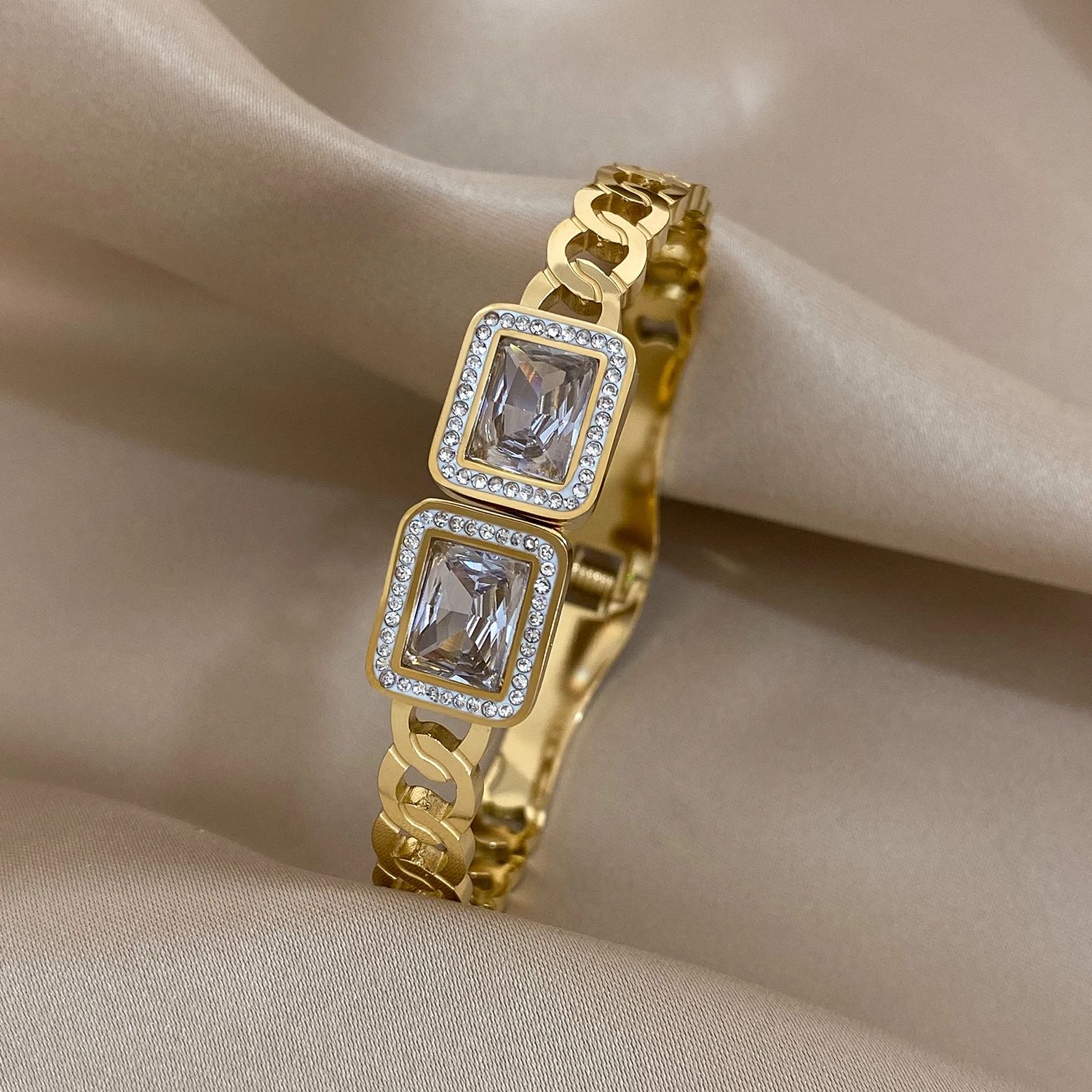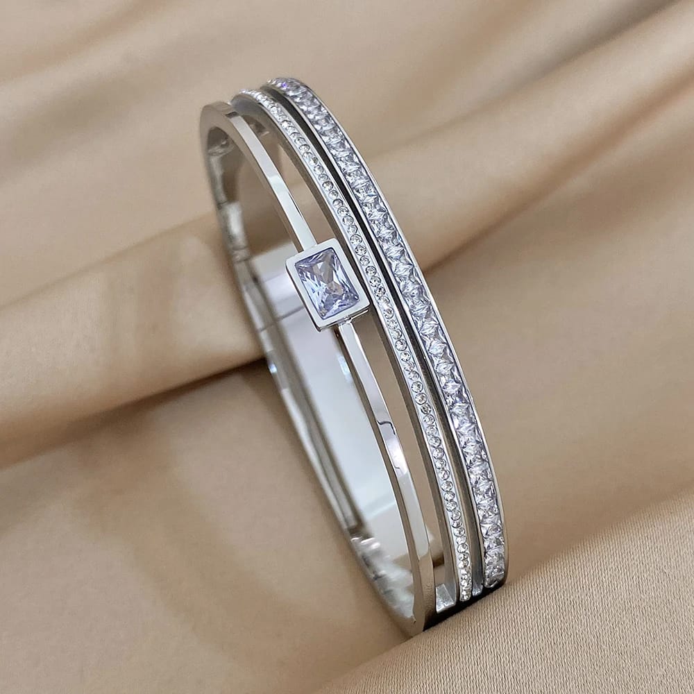 سوار فاخر بتصميم مزدوج مرصّع بكريستالات براقة ومربع حجر مركزي بلون مختلف، يجمع بين الفخامة والبساطة. مصنوع من فولاذ مقاوم للصدأ ومطلي بلون الذهبي أو الفضة لإطلالة أنيقة تدوم. متوفر بلون ذهبي مع حجر شفاف، فضي مع حجر أبيض، وذهبي مع حجر زمردي أخضر. مثالي للهدايا والمناسبات الخاص
