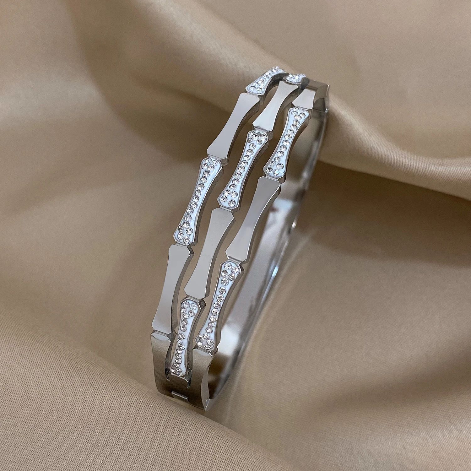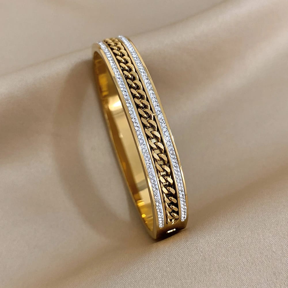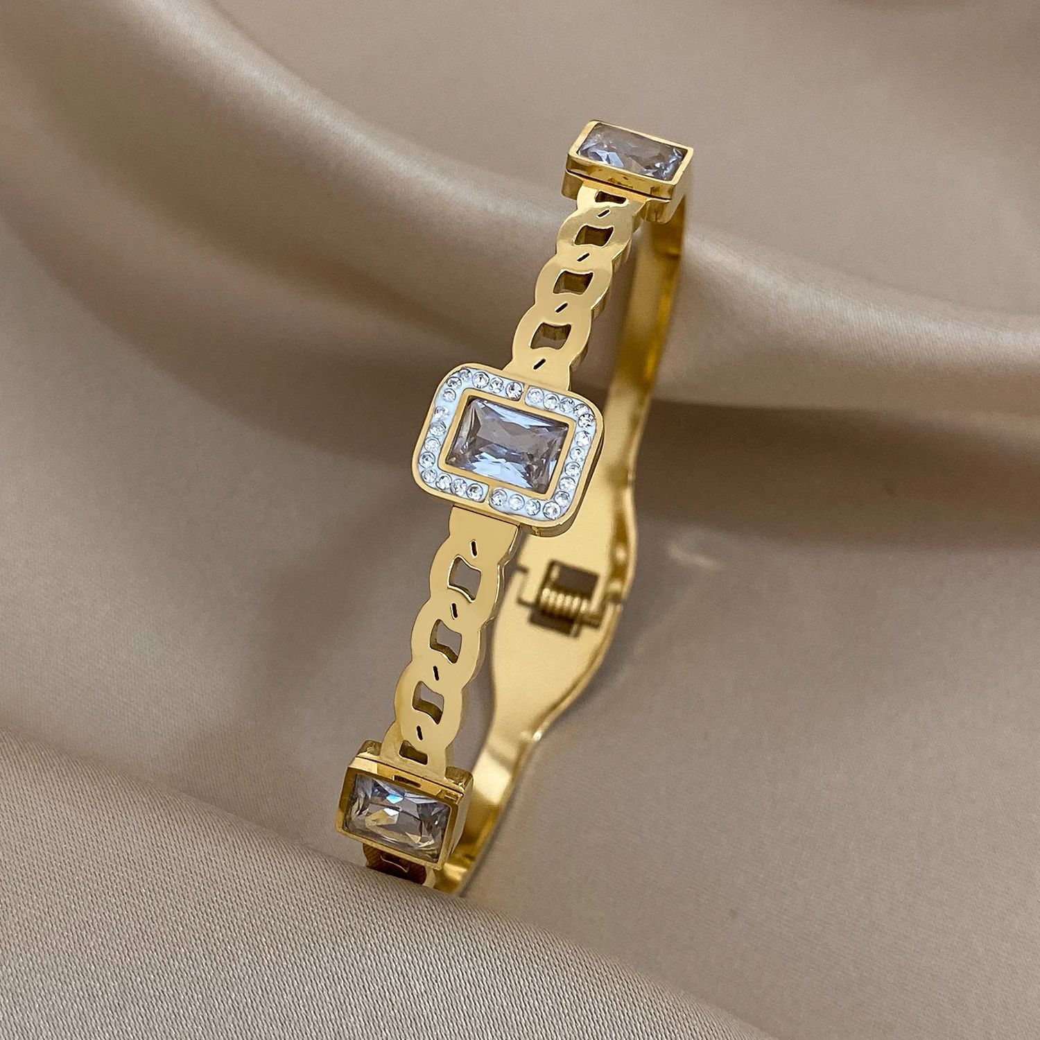سوار فاخر بتصميم مزدوج مرصّع بكريستالات براقة ومربع حجر مركزي بلون مختلف، يجمع بين الفخامة والبساطة. مصنوع من فولاذ مقاوم للصدأ ومطلي بلون الذهبي أو الفضة لإطلالة أنيقة تدوم. متوفر بلون ذهبي مع حجر شفاف، فضي مع حجر أبيض، وذهبي مع حجر زمردي أخضر. مثالي للهدايا والمناسبات الخاص
