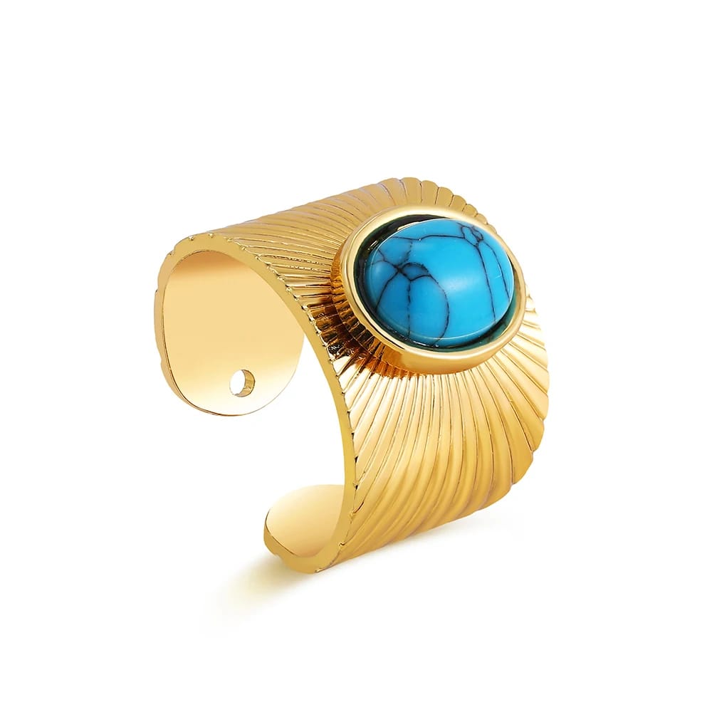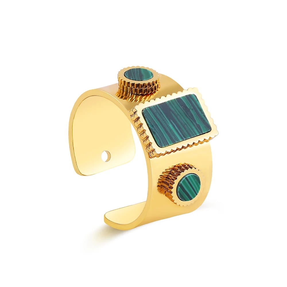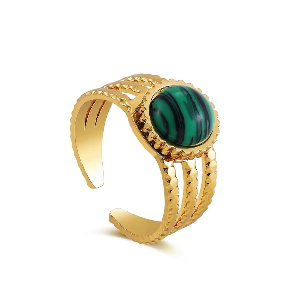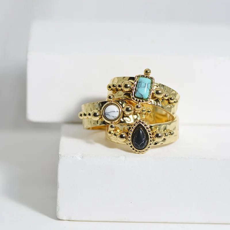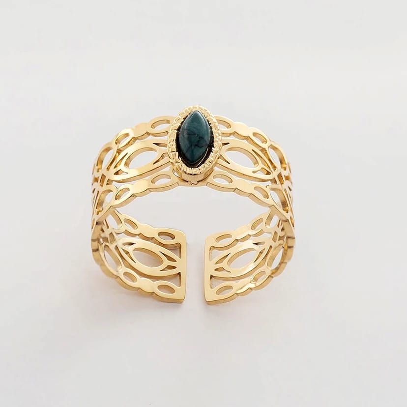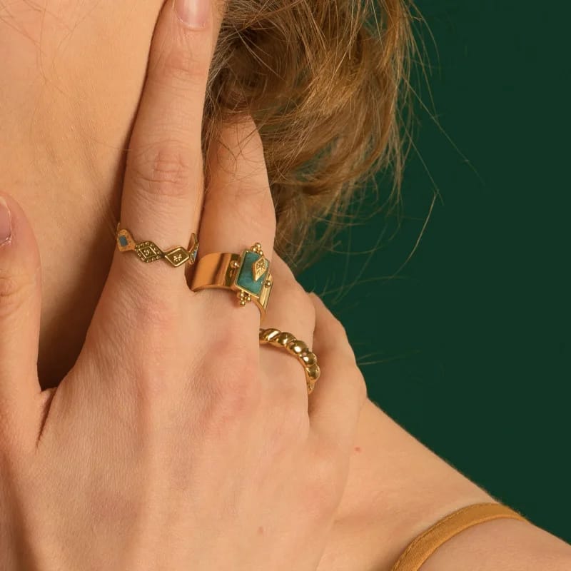 خواتم "وهـج" بتصميم فريد يمزج بين الفخامة والبساطة، مصنوعة من فولاذ مقاوم للصدأ ومطلية بلون الذهبي بعناية لتمنحك لمعان يدوم. مزينة بحجارة طبيعية بألوان جذابة تعكس الذوق الرفيع واللمسة الفنية الراقية.